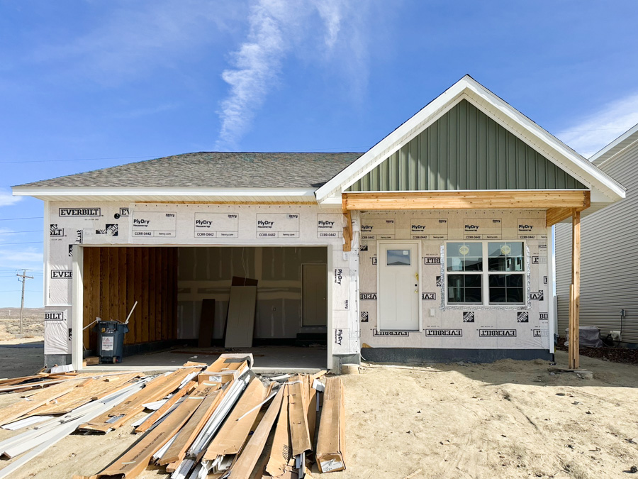 The main floor primary suite includes two large windows for natural light, a generous walk-in closet, and an en suite bathroom. Two additional bedrooms are tucked down a separate hallway and share a full bath, offering both privacy and comfort. Nearby, the laundry room adds convenience, and a drop zone with board-and-batten detailing. Wall hooks near the garage entry provide a practical space for coats, backpacks, and bags.