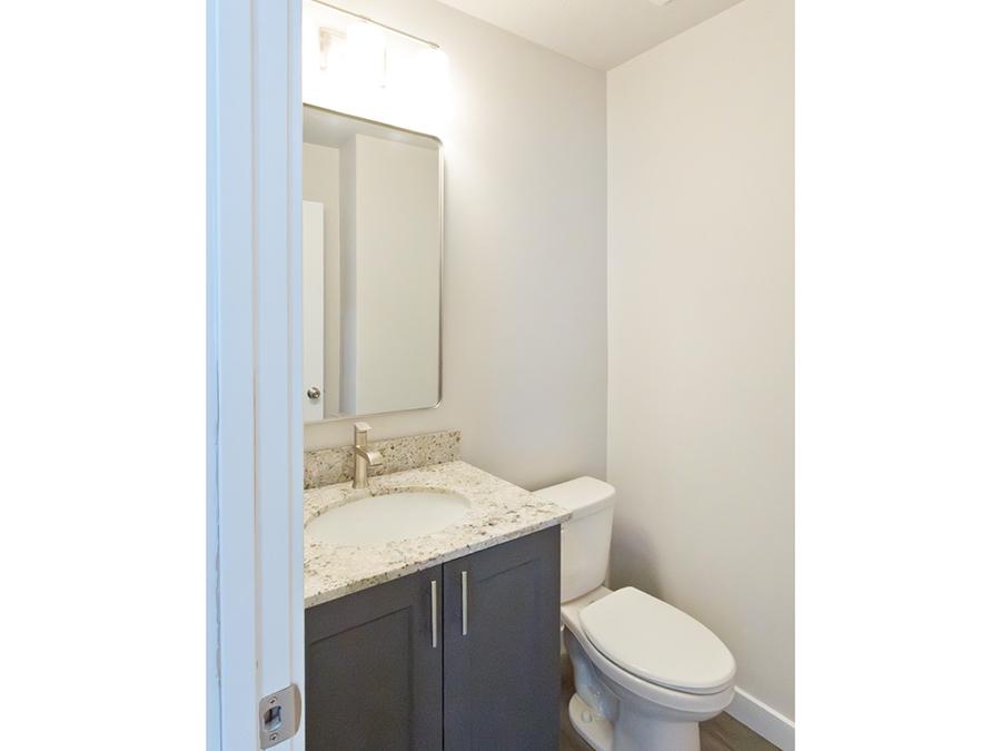 The kitchen features storm gray cabinets, solid granite countertops, a large basin sink, satin nickel finishes, and a generous island perfect for entertaining or daily meals. A conveniently located half bath rounds out the main level.